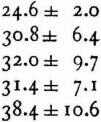 The series are arranged according to different plans. In some of them, all observations are made with the same or only two different overweights, in order to get as extensive figures as possible for the calculation of the essential time interval. For these I have calculated the means of the time-lapse between stimulation and muscle reaction for both points on the nerve, the difference between these means which corresponds to the rate of conduction in the nerve, and finally, in order to evaluate their exactness, the probable errors of all these values according to the rules of probability.