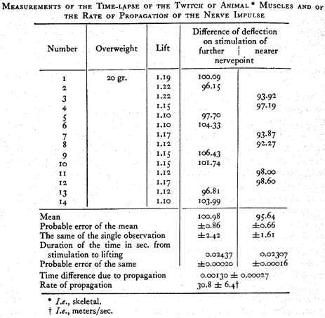 Finally, the rate of propagation of the nerve impulse was calculated after each experimental series. To do this, one must know the length of the traversed nerve piece, that is, the distance between the terminals at the two stimulated nerve places closest to the muscle. Unfortunately this length is very uncertain on account of the great extensibility of the nerve. If the nerve is not stretched, its fibers are bent in an undulating fashion; in order to measure its length I have always stretched it to such an extent that the transverse satin-like striations of its surface disappeared, on the assumption that the fibers would then run approximately straight. But a few millimeters are then always left to one’s own discretion. Incidentally, it would not yet pay to devise an improved measuring technique since the inaccuracies of the time measurements are relatively much greater than those of the length measurements. Therefore it is not surprising that the established values of the rate of conduction still differ considerably from each other. ...