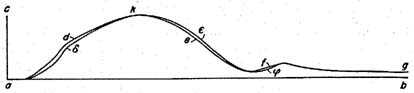 If the animal parts are rather vigorous and fresh, then the shapes of the double curves are all alike, at whatever nerve spot one may start the stimulation. Then, each drawing consists of two curves of congruent shape which are shifted in a horizontal direction with respect to each other by a certain amount as in Fig. II, such that the curve which has been drawn upon stimulation of the nearer nerve spot, is also nearer to the starting point of stimulation. The curve adefg corresponds to the stimulation of the nearer nerve point,